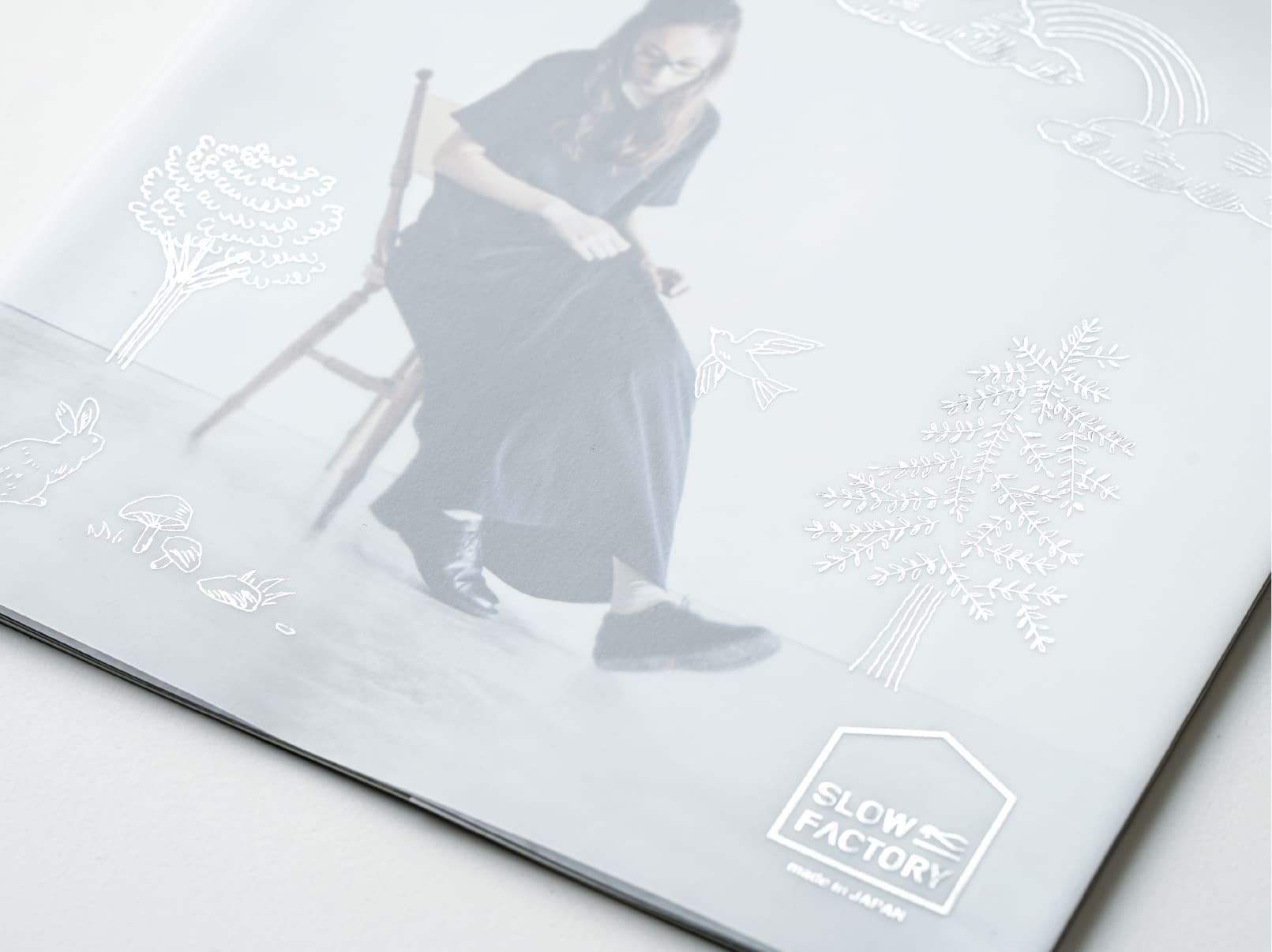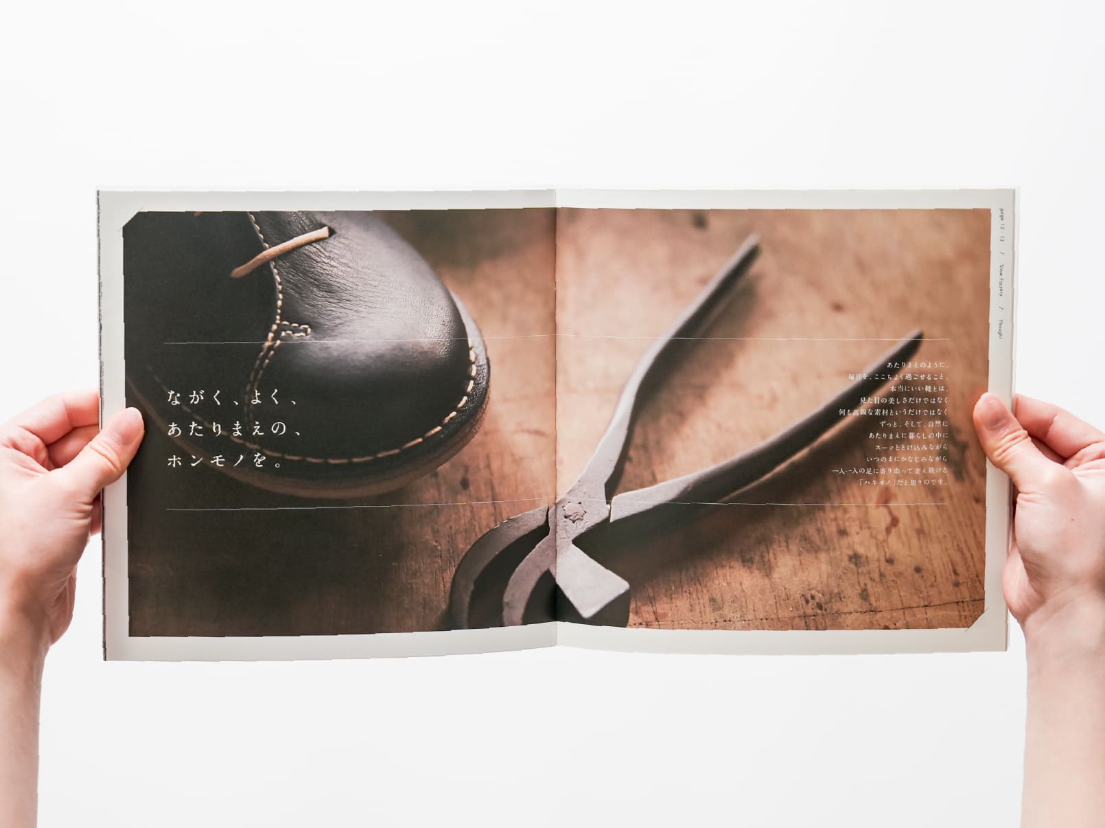 レディスの革靴という商品の魅力を伝えるため、穏やかで品があるけれど、どこか奔放な魅力のある女性をイメージして制作したブランドブック。モデルはオーディションにて選定し、共に世界観を構築していきました。箔押しが施されたトレーシングペーパーのカバーで演出した特別感もこだわりの一つです。