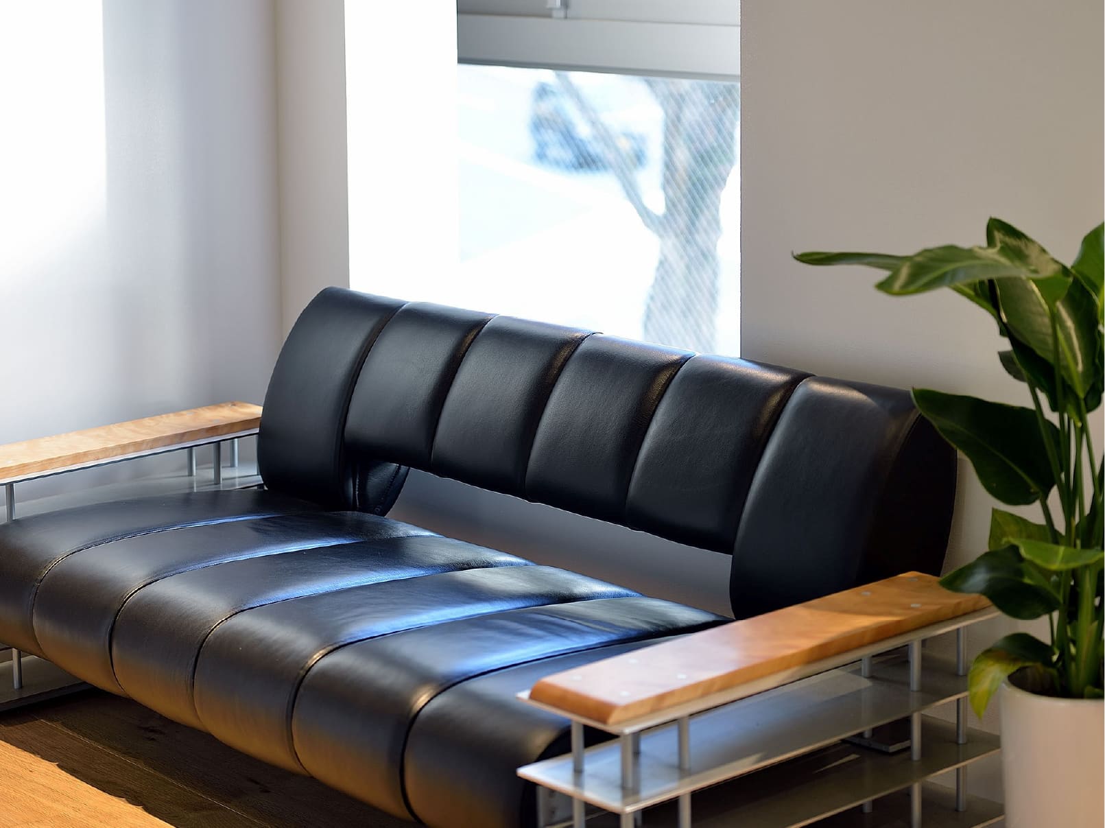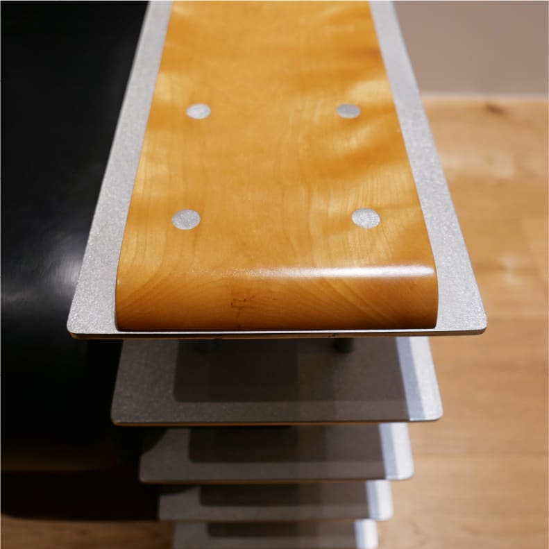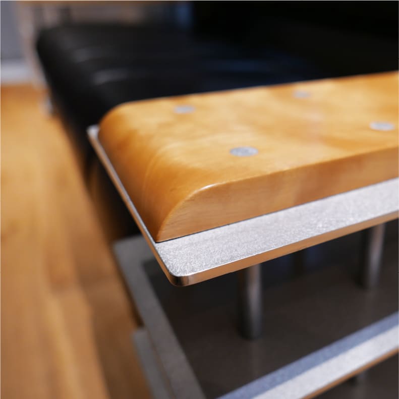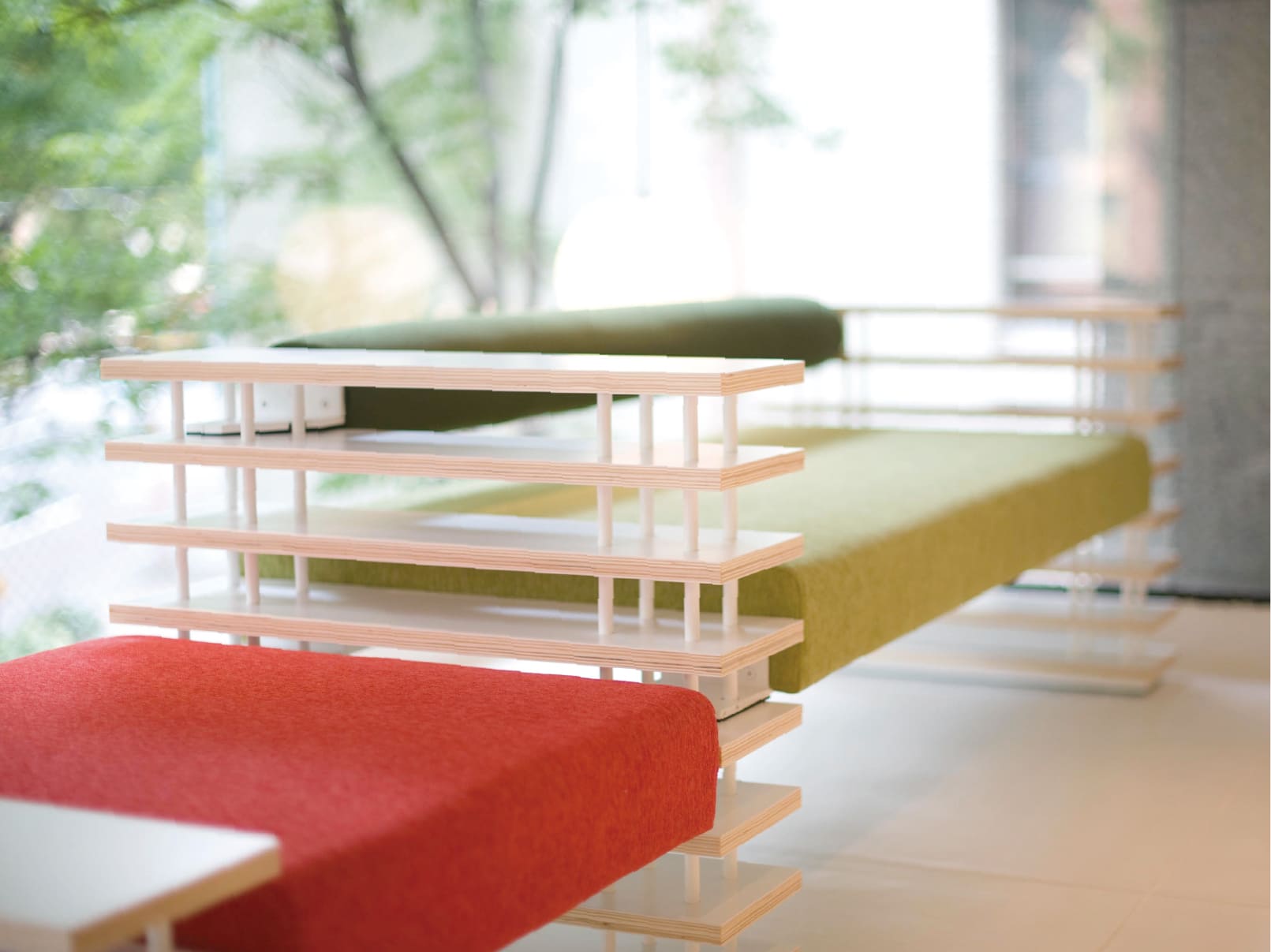 成長に応じて変化するオリジナルソファ『grow-sofa & bench』。1人掛けから4人掛けまで対応でき、高さも子どもから大人まで上下に調整可能。左右にエンドレスに繋げられます。手すりはドリンクや本を置くスペースに適しています。